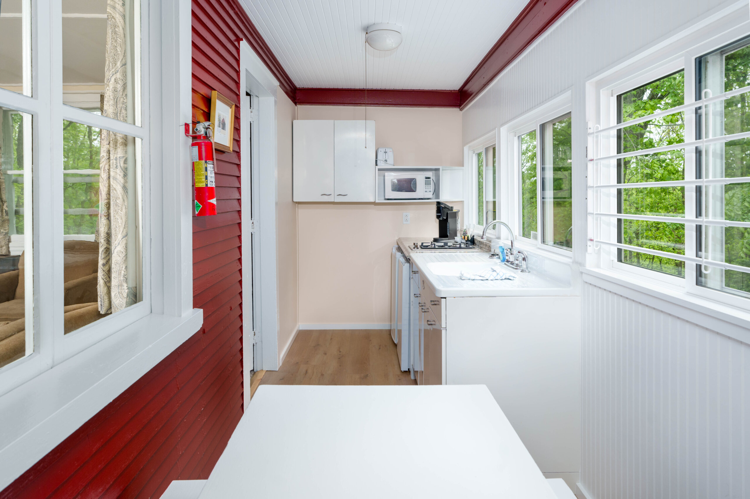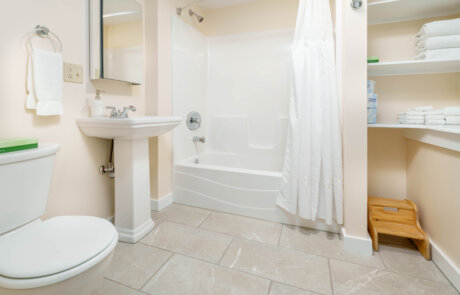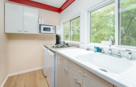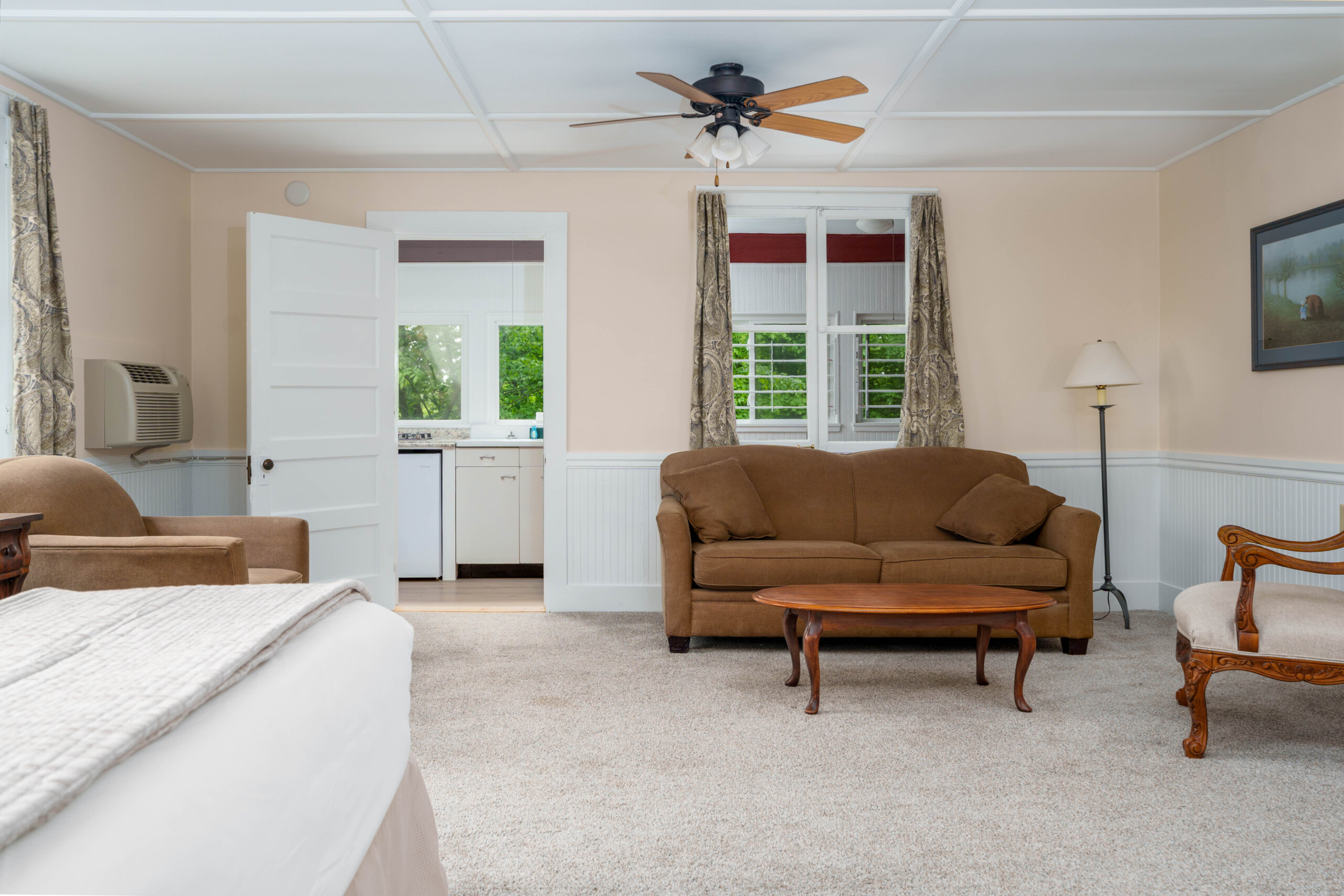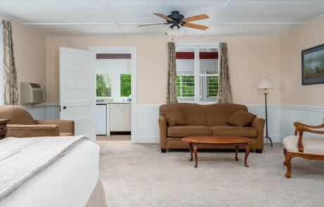 For 2 to 4 people- 2-room suite in Ferncroft, about a 10-minute walk from the Inn. Has a large main bedroom/sitting room with king bed, sofa and a/c which serves both bedrooms; a second bedroom with two twin beds; a kitchenette with dining area and under the counter refrigerator and freezer; a full bath; and small alcove with a door between the main bedroom and twin room. A crib can be added in the alcove. It’s necessary to walk through the main bedroom to access the other rooms. There is a certain amount of traffic noise from Route 7 and the Interstate (by rural standards).