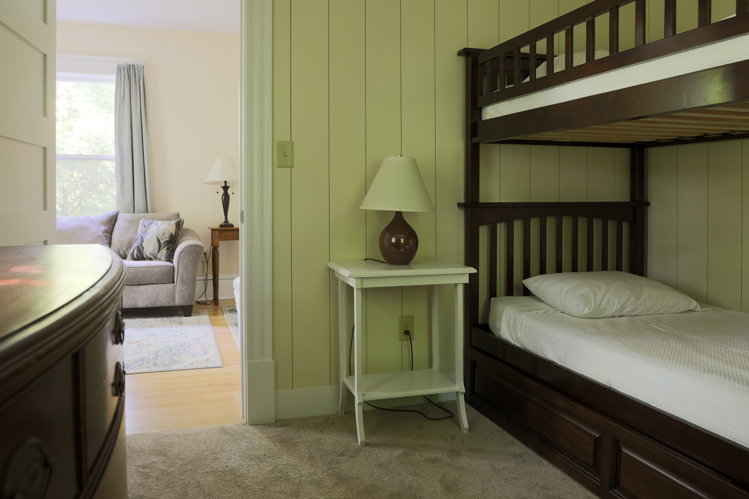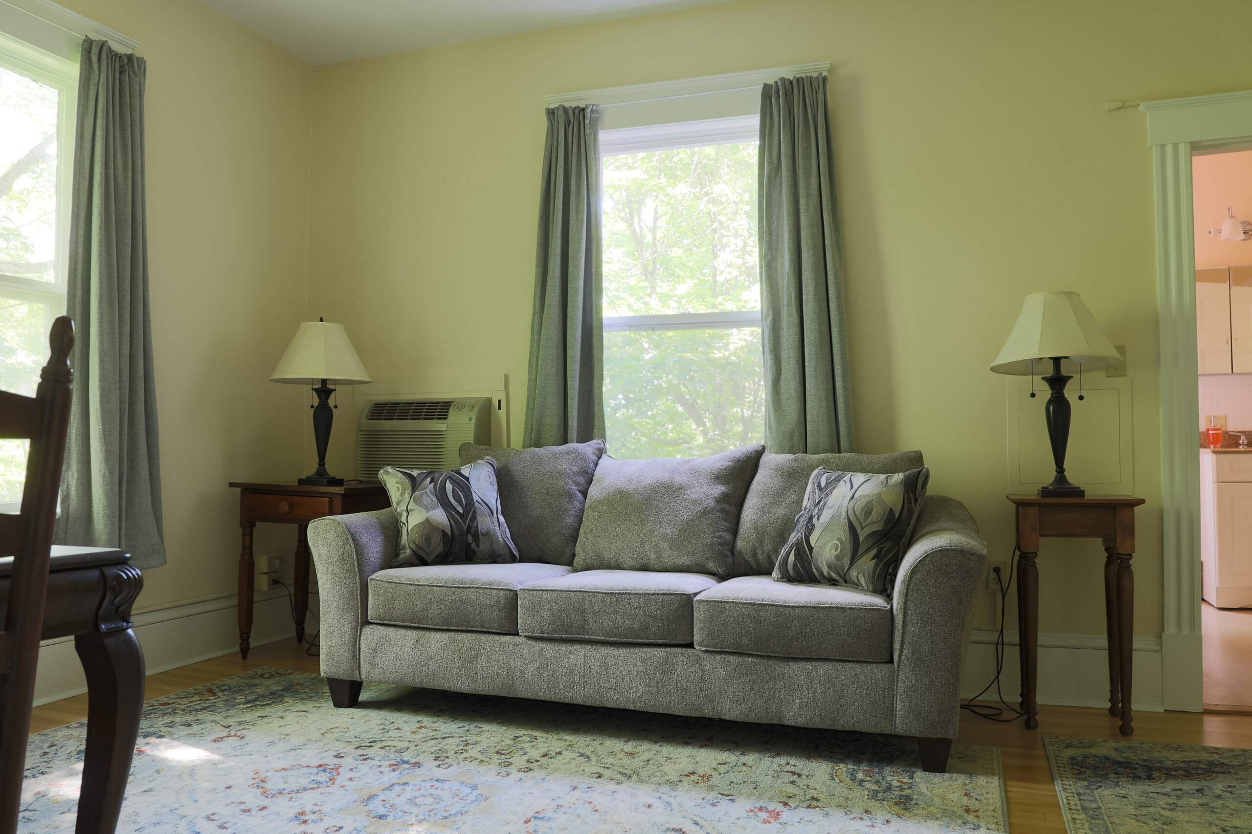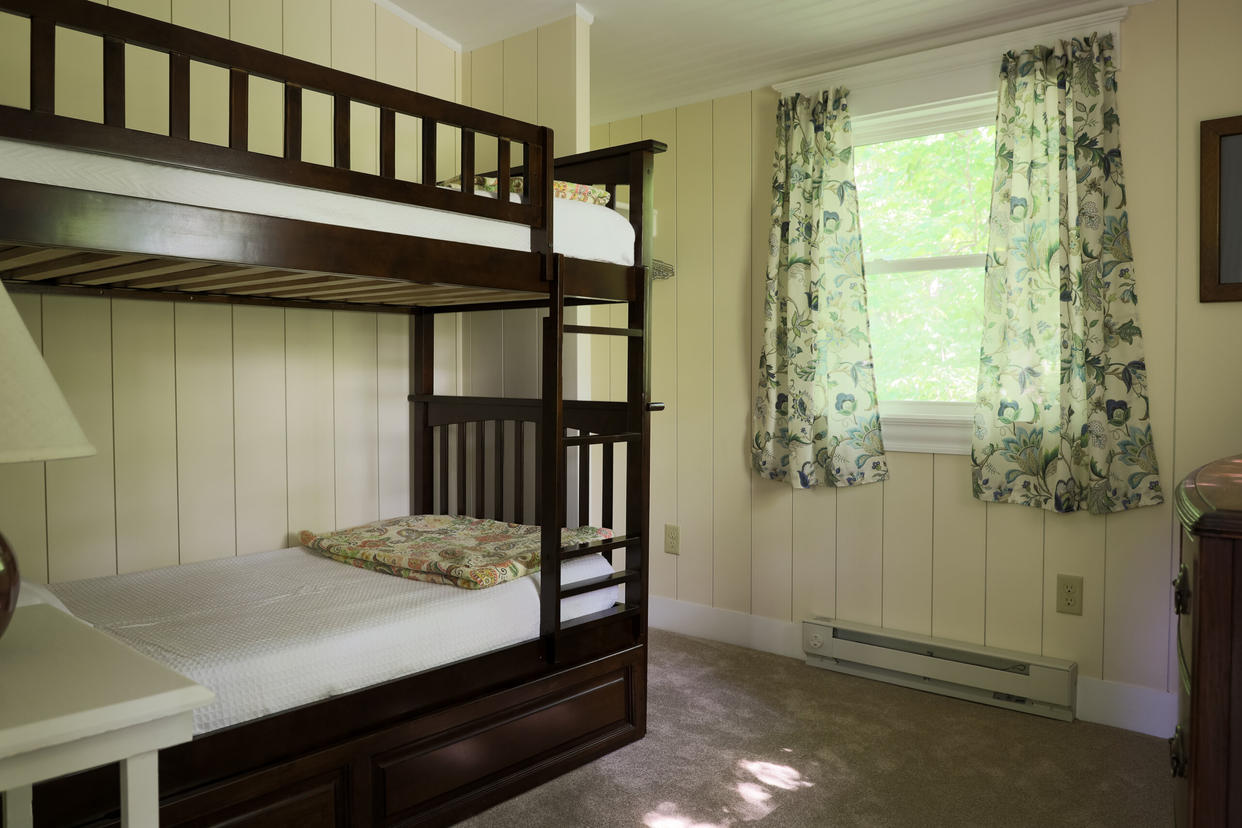 For 2 to 5 people- 3-room suite in Ferncroft about a 10-minute walk from the Inn. Has a main bedroom with king bed and a/c; a second bedroom with bunk beds and trundle, a/c, and room for a crib; a combined kitchenette/living room with hardwood floors, sofa, dining table with chairs, and under the counter refrigerator, a full bath; and a screened porch. There is a certain amount of traffic noise from Route 7 and the Interstate.