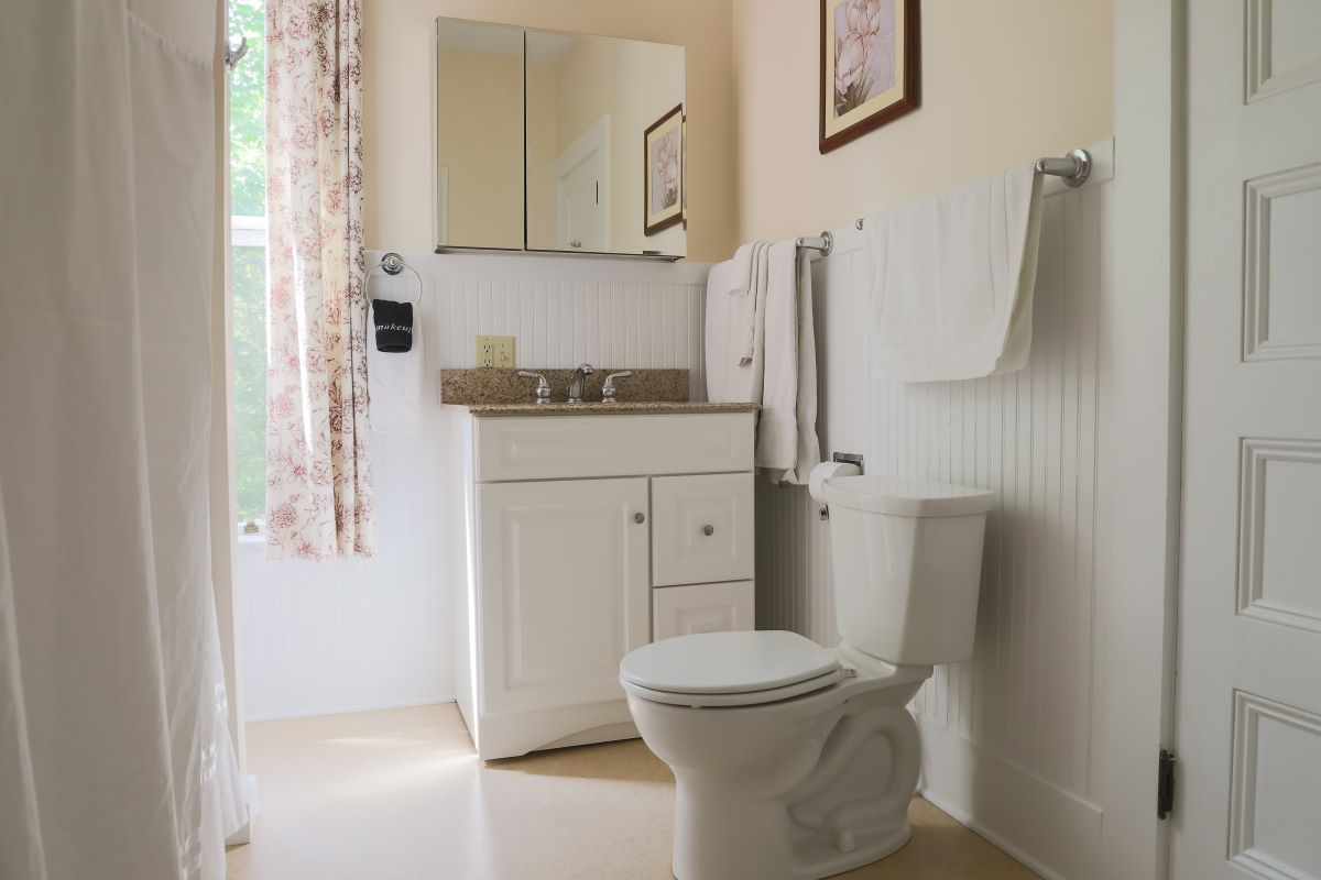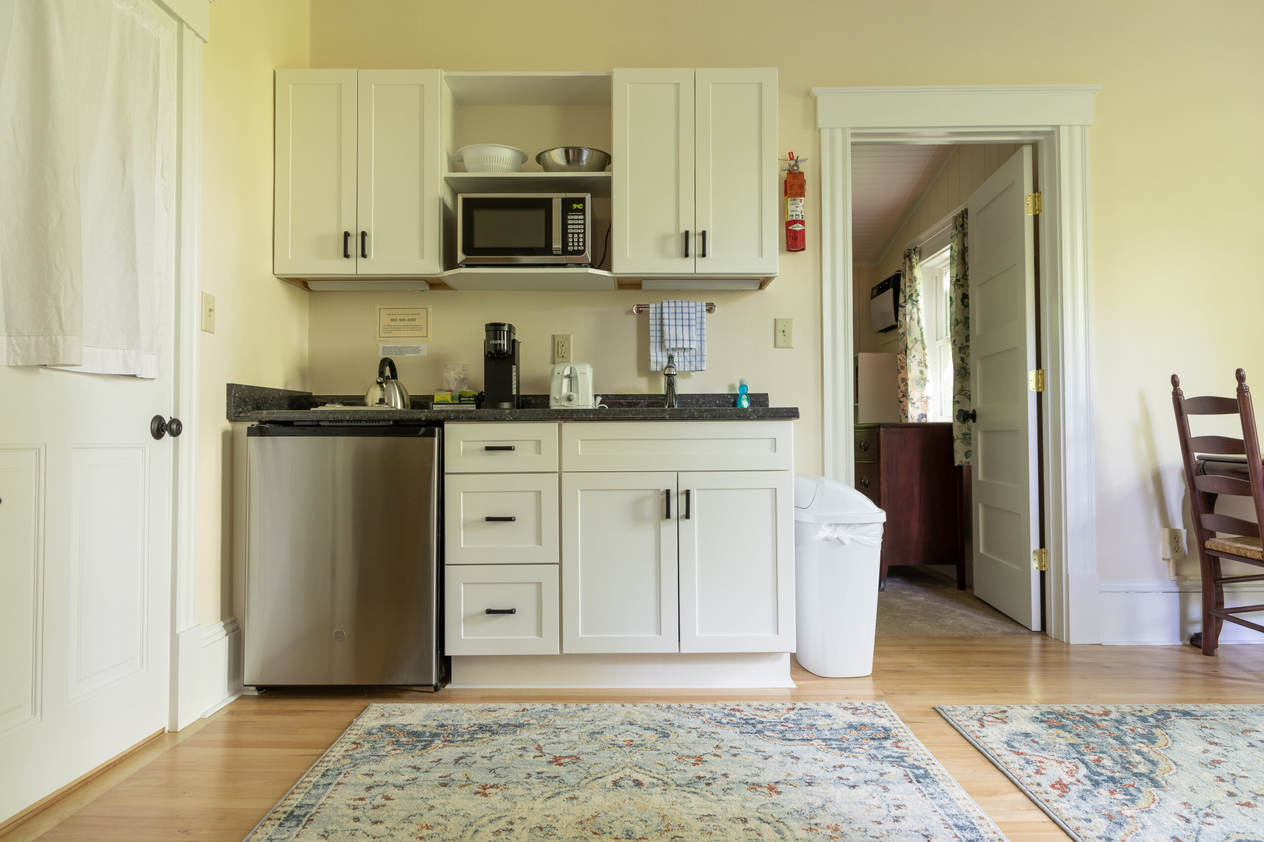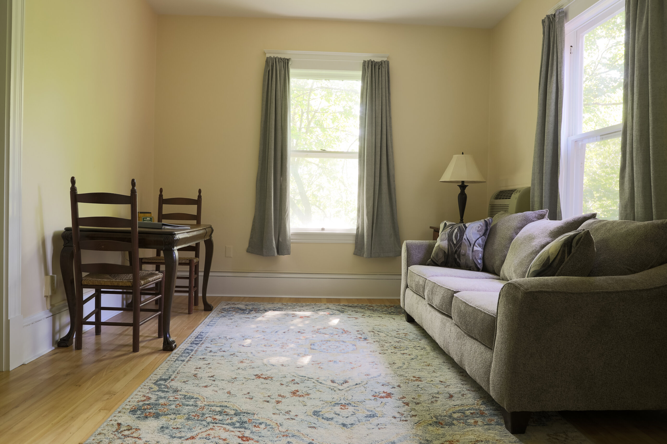 For 2 to 5 people- 3-room suite in Ferncroft about a 10-minute walk from the Inn. Has a main bedroom with king bed and a/c; a second bedroom with bunk beds and trundle, a/c, and room for a crib; a combined kitchenette/living room with hardwood floors, sofa, dining table with chairs, and under the counter refrigerator, a full bath; and a screened porch. There is a certain amount of traffic noise from Route 7 and the Interstate.