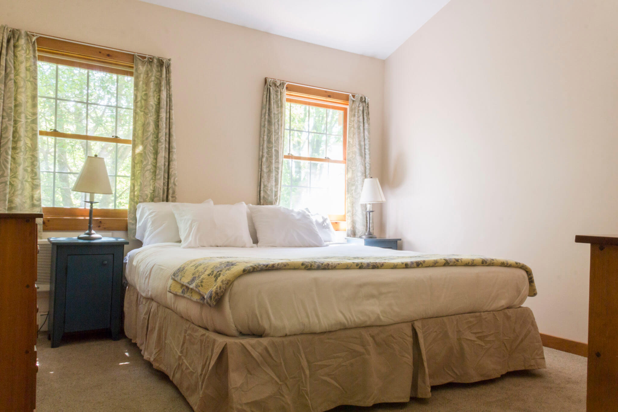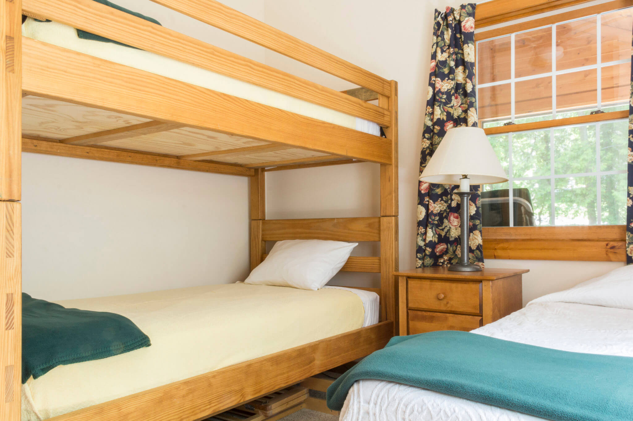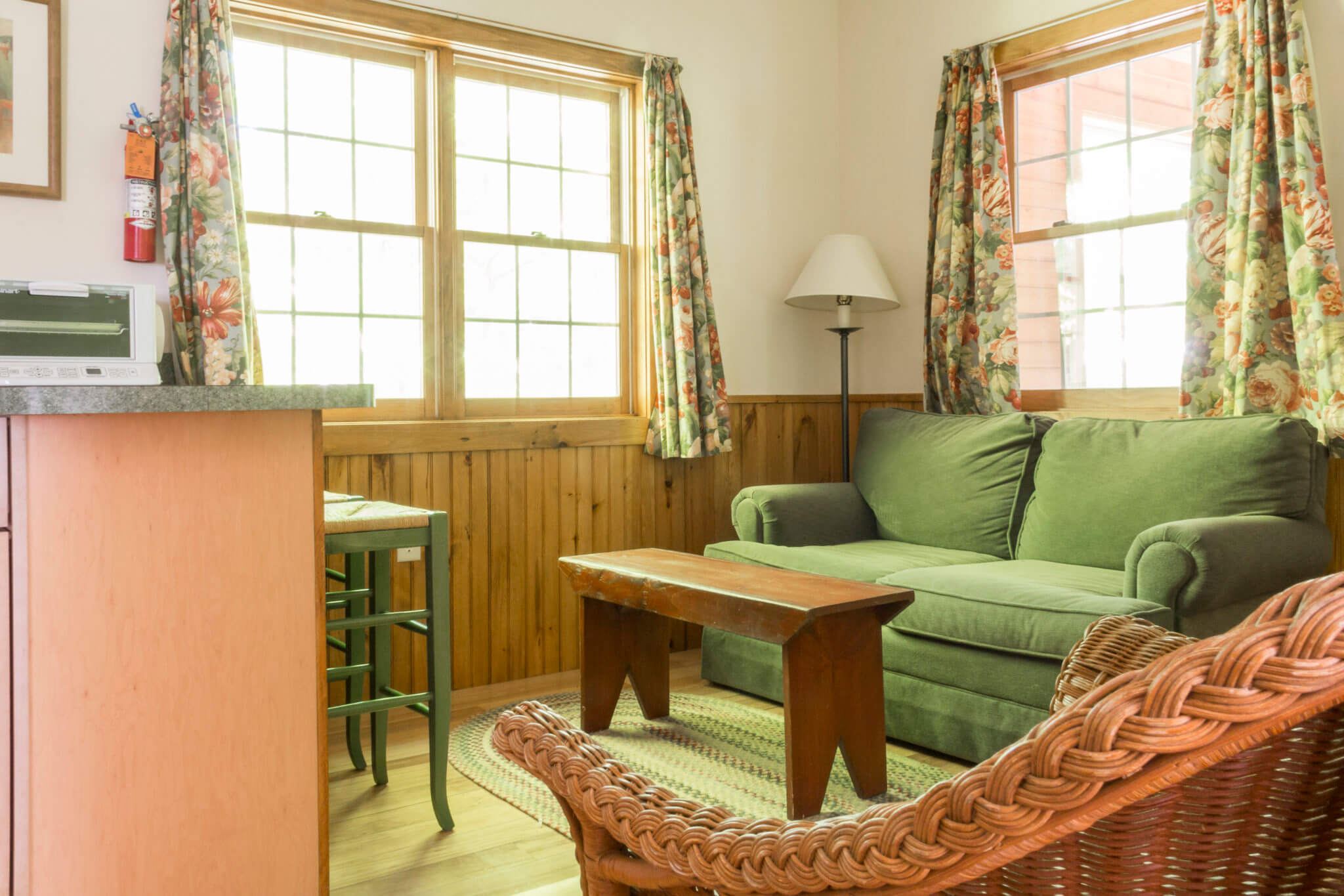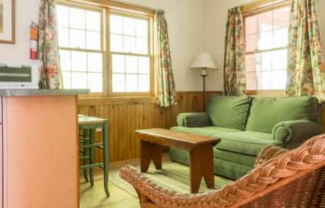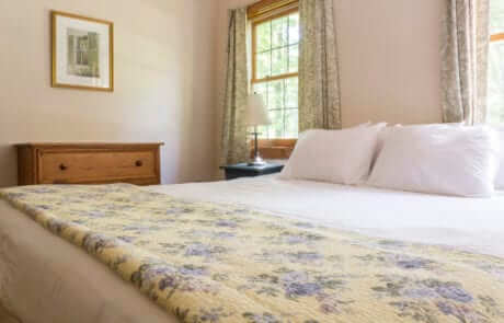 For 3 to 5 people – 2-bedroom ground floor suite in Franklin House located near Elmwood. About a 10- minute walk to the Inn. Has a main bedroom with king bed and a/c; a room with bunk beds, a twin and a/c; a small living room; kitchenette with full sized refrigerator; a full bath; and screened porch. Living room and kitchen area have wood floors. The building faces U.S. Rte. 7 and the interstate, so there may be a certain amount of traffic noise (by rural standards).