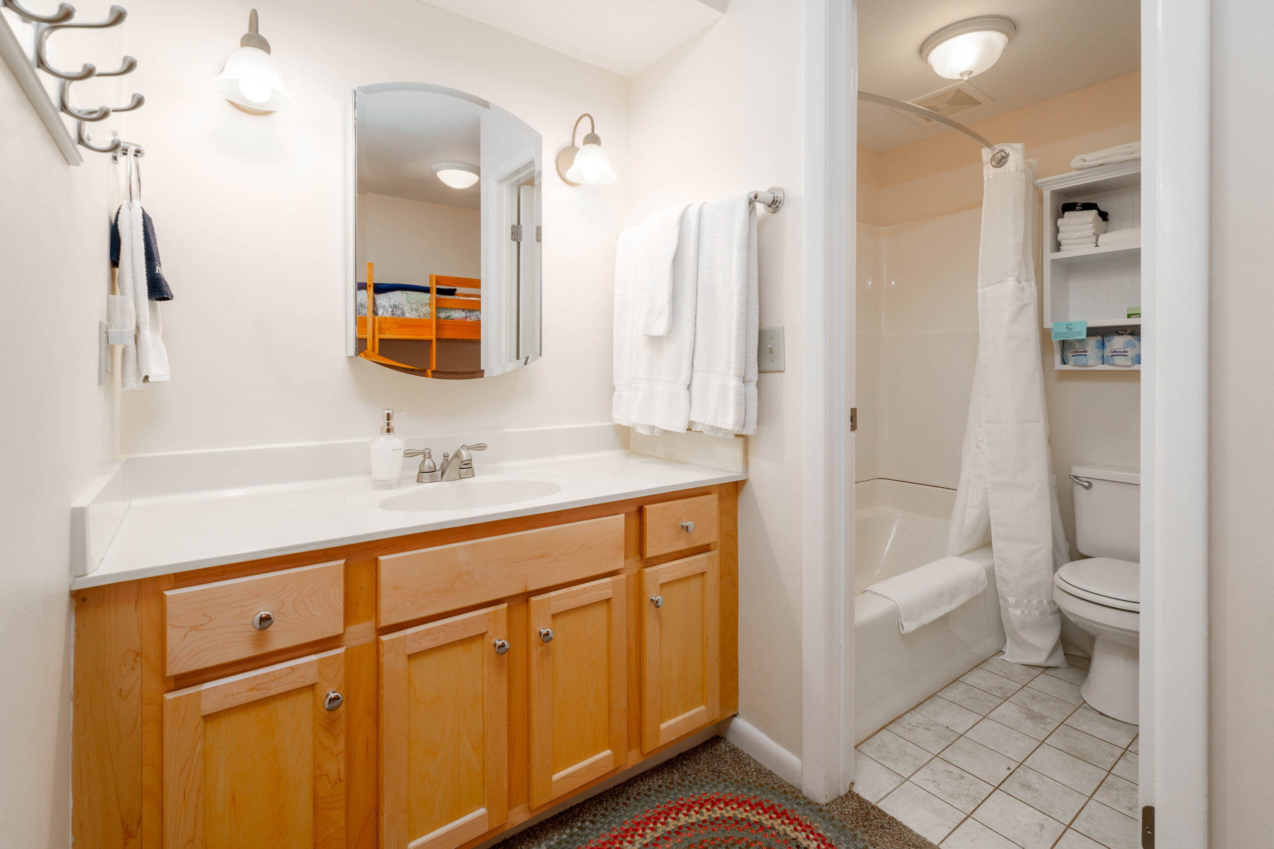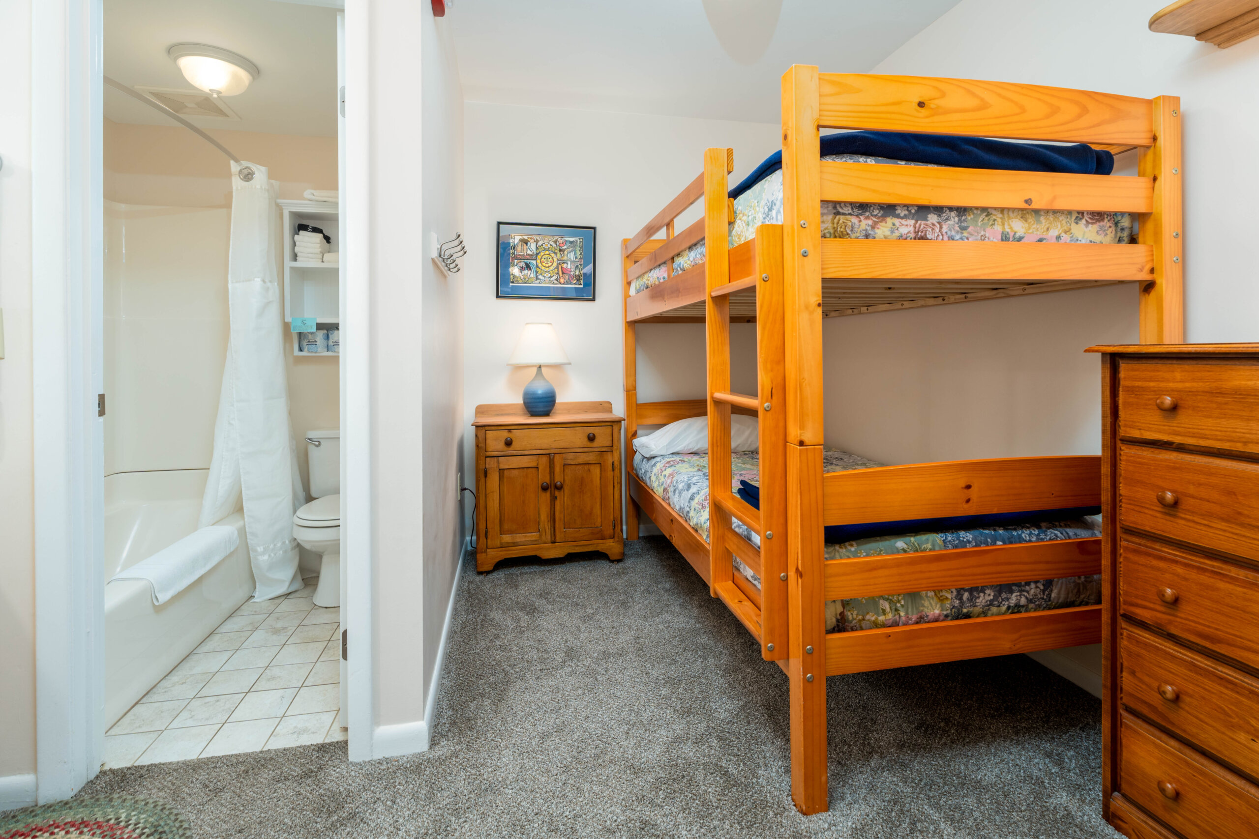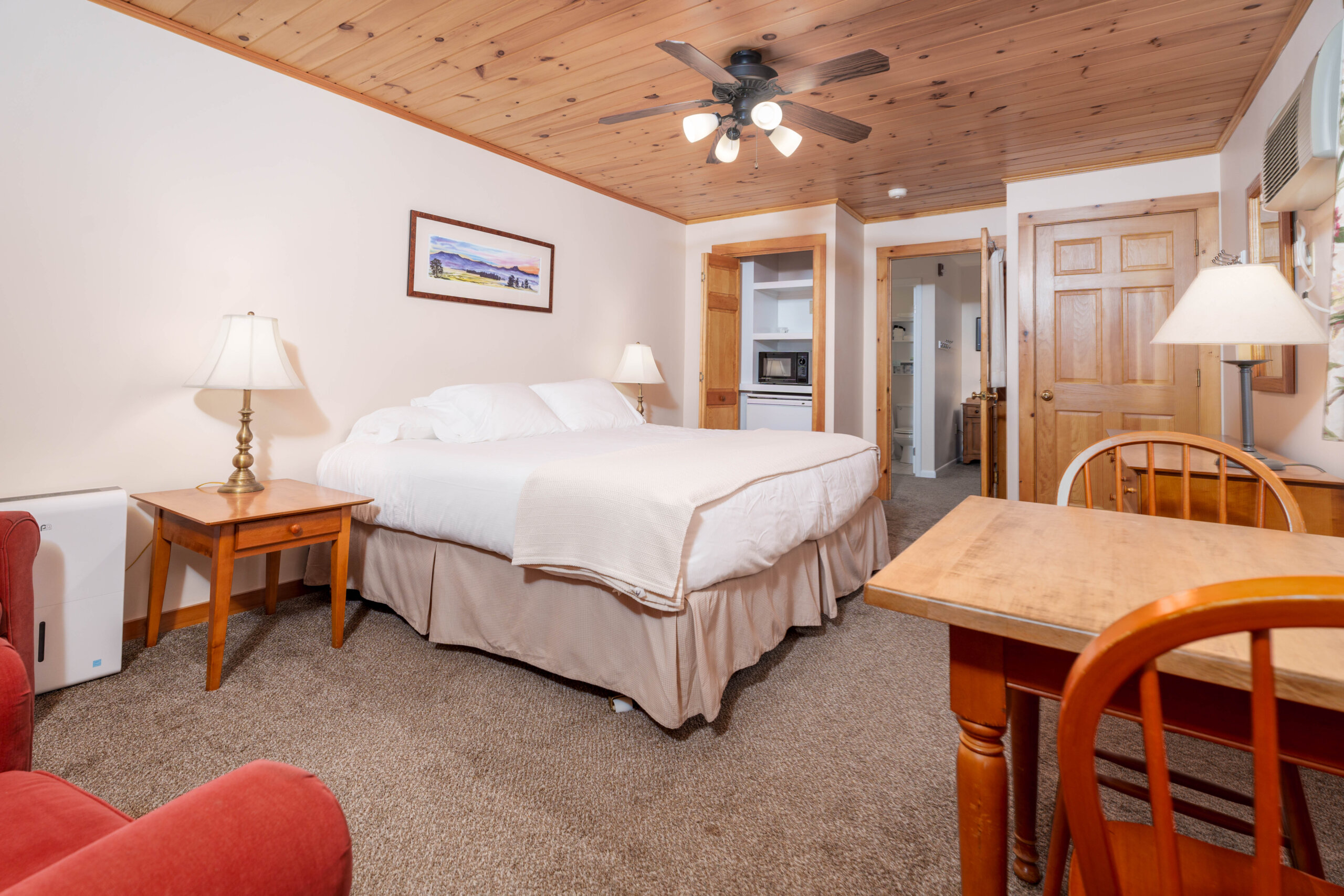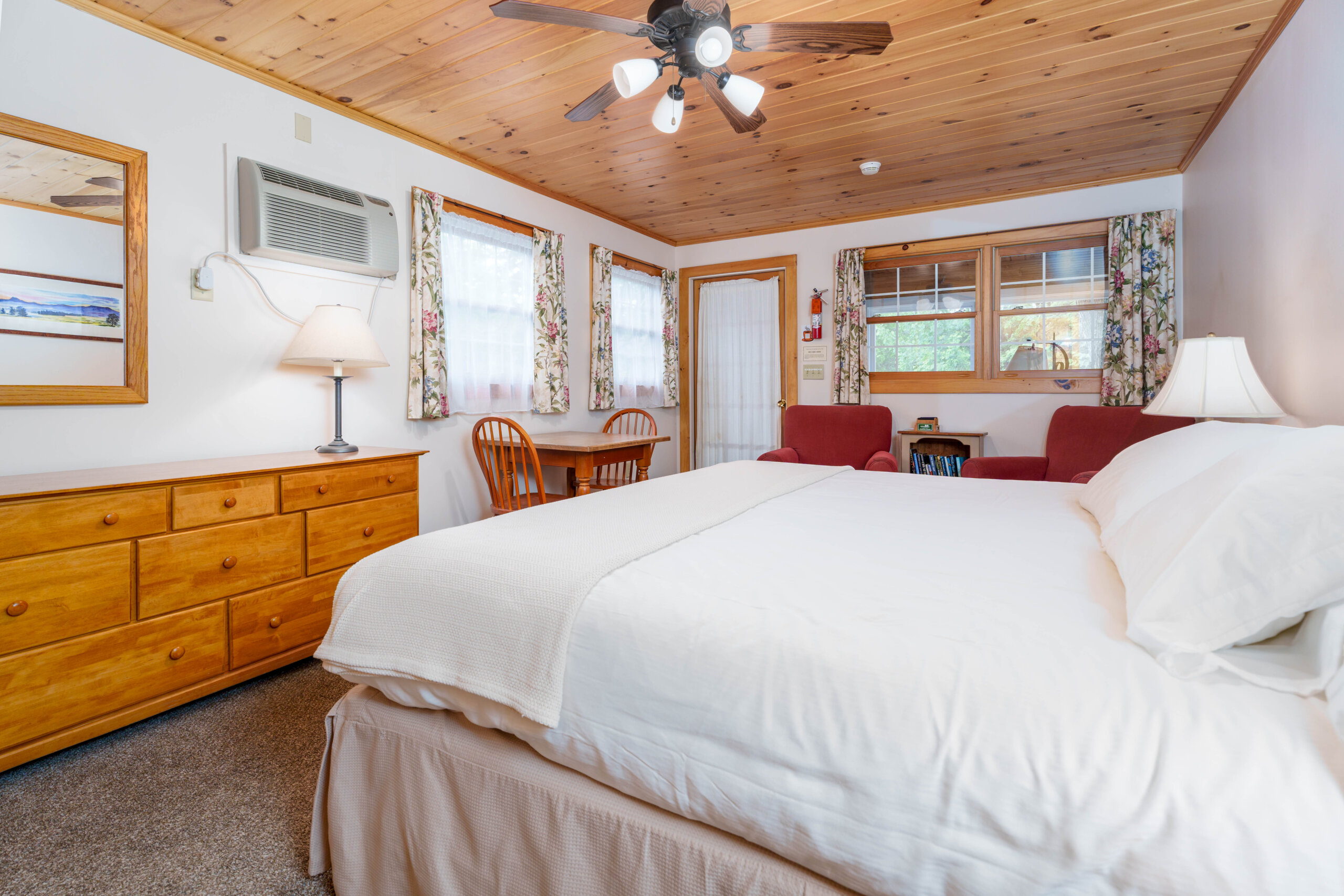 (Identical) for 2 to 4 people – 2-room suites on the ground floor of the Inn. Each has a main bedroom with king bed, a/c, and sitting/reading area, an under the counter refrigerator, and a microwave; a small sleeping alcove with built-in bunk beds and a door separating it from the main bedroom. Has a full bath and screened porch. Must go through the alcove to reach the bathroom.