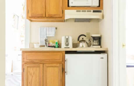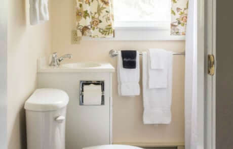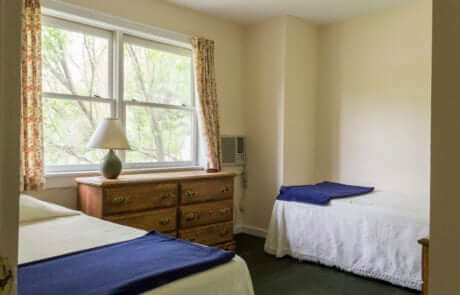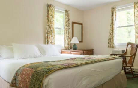For 3 to 4 people –2-bedroom suite about a 3-minute walk to the Inn. Has a main bedroom with king bed and a/c; a bedroom with twin beds and a/c; a living room with a fireplace and loveseat; a small walk through kitchenette with an under the counter fridge; a full bath; and a screened porch. Shares an entrance hallway with Partridge II.